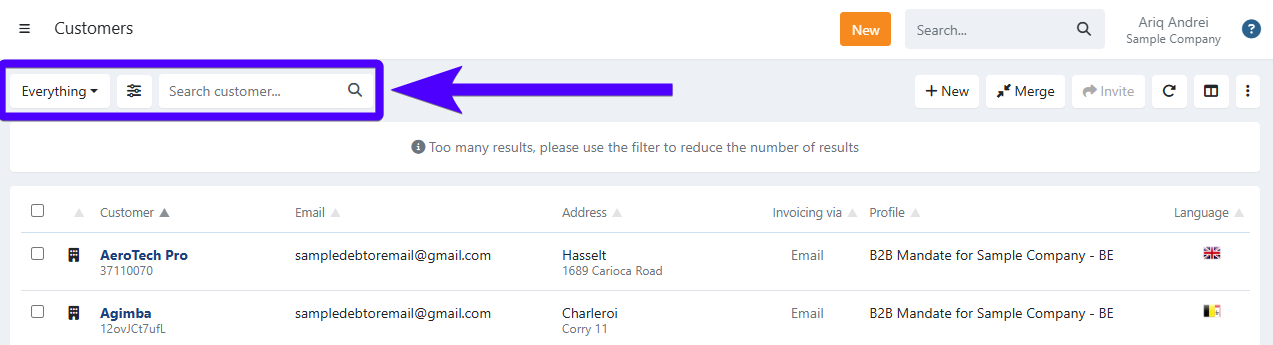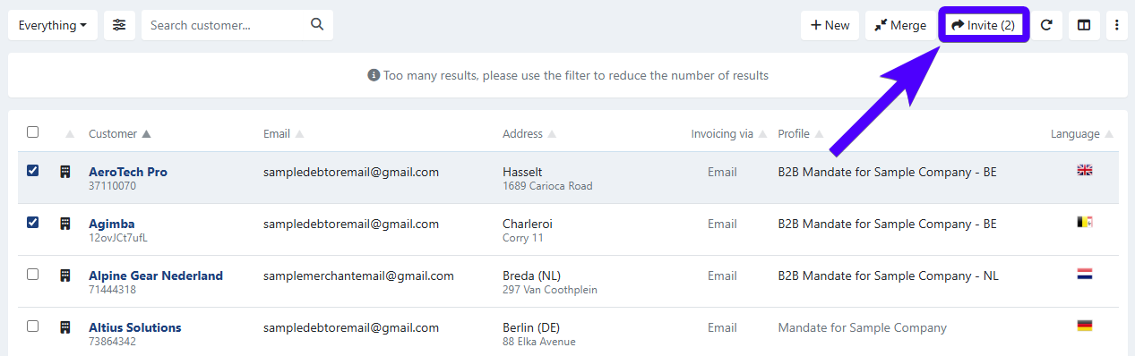 This method is ideal if you would like to invite customers with specific conditions (for example: customers that don't have an agreement yet, customers that already have invoices, customers from a certain profile, etc.). Simply use the search bar and filters (as mentioned on step No.2 on the procedure above).