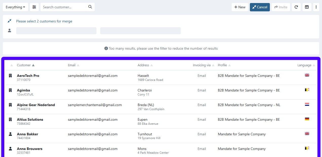 - Optional: If needed, you can adjust which customers are displayed on this interface. Use our search bar and filters to adjust this. You can use it to pre-select customers based on certain properties (for example: to separate company-type customers from person-type customers).