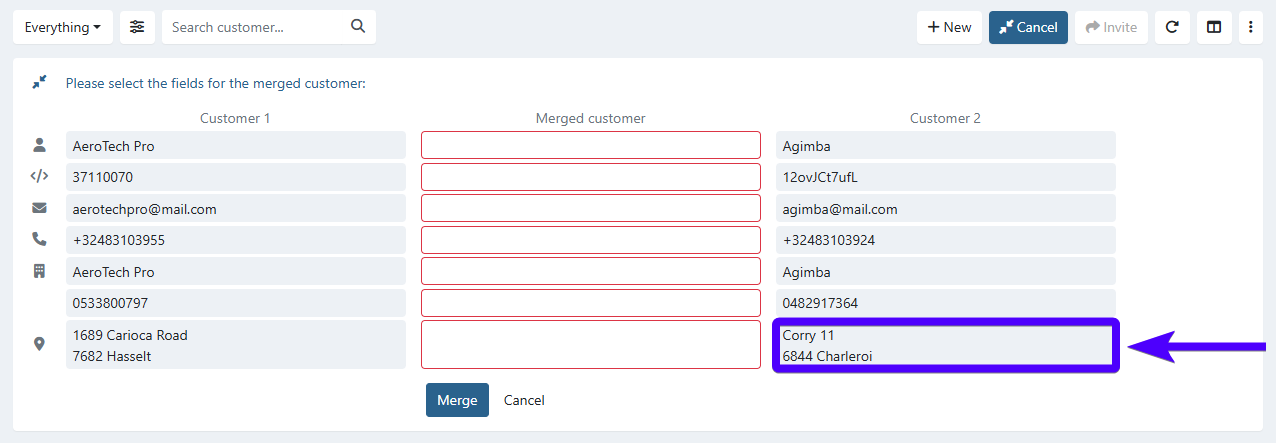 For example, you'd like for the merged customer to inherit Customer 2's address. In that case, you'll need to click on Customer 2's address, as shown in the screenshot below: