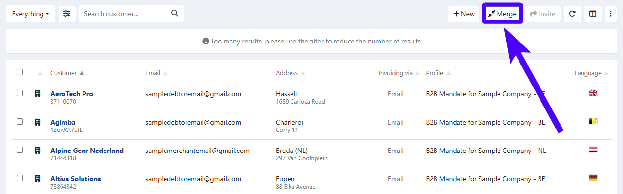 - To merge company-type customers that have recently underwent a merger or acquisition process. For example: Both Company A and Company B are your customers. However, one day, Company A acquired Company B. Thus, it's logical to merge Company A and Company B into a single customer in your Twikey environment, as they have become one business entity in the real world.