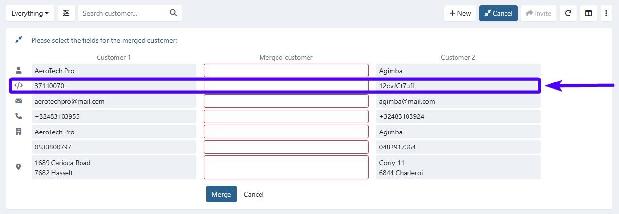 Make sure that the newly merged customer will inherit the correct customer number - as this is one of the main ways of identifying a customer. Customer numbers are widely used in Twikey (for example: for sending invoices to a customer, for exporting and importing data from Twikey, and for various other purposes). The customer number can be selected in the second row, as shown in the image below.