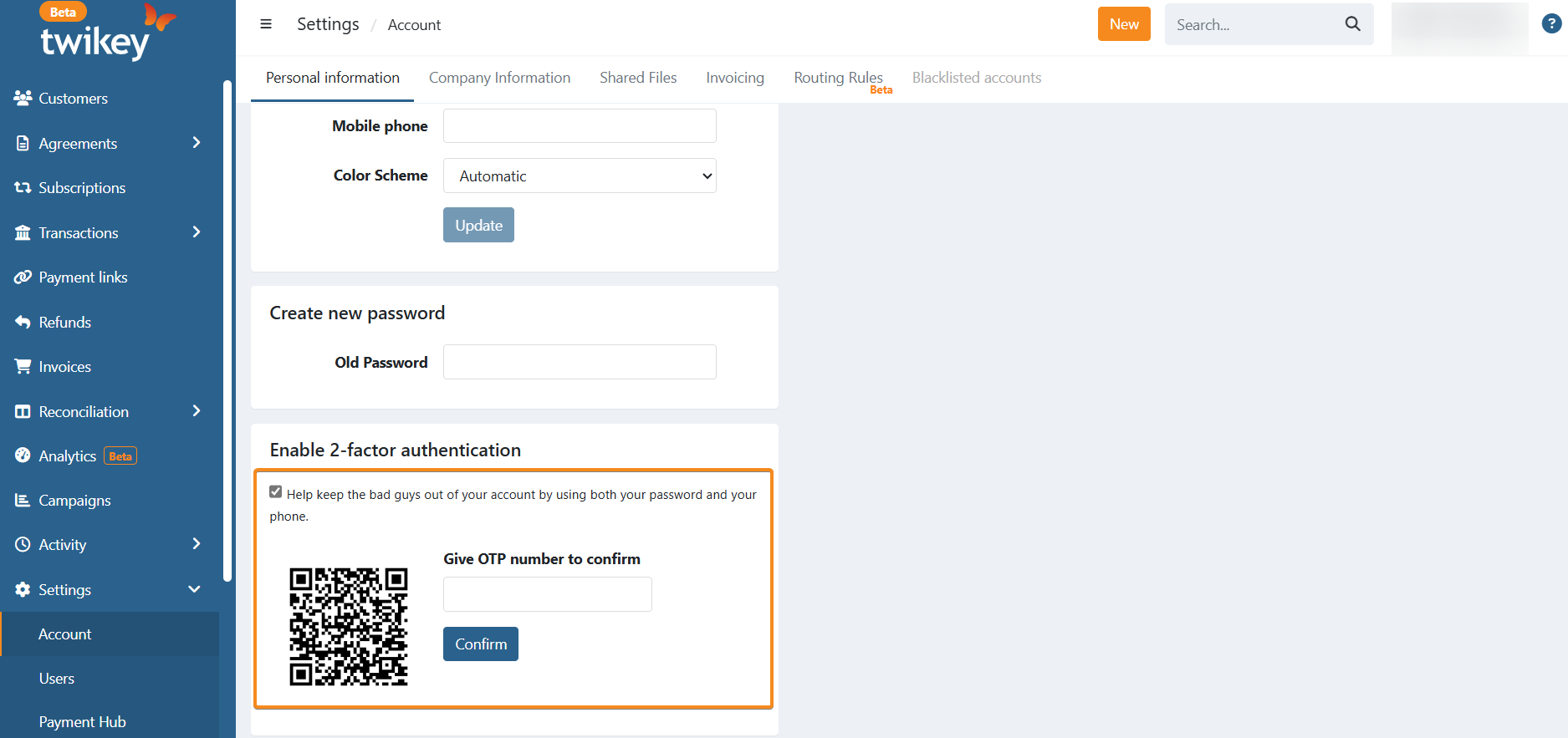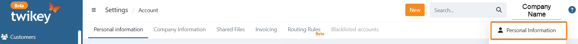 - Log into Twikey and go to Personal Information by clicking your username in the top-right corner.