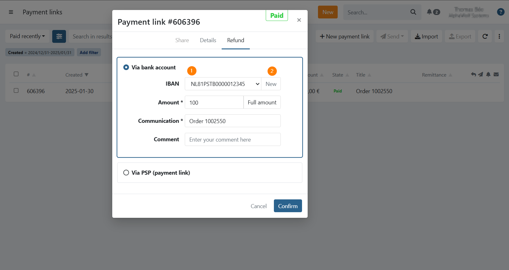 Account (1) : Select a beneficiary account. If an IBAN was captured from the PSP it will appear in the list.New (2) : Add a new IBAN on the spot — it will be saved as a beneficiary account on the customer.Amount : Amount to refund (full amount is prefilled by default).Communication : The refund communication.Comment : Optional internal comment.Click Confirm . The refund is added to the To be sent batch on your Refunds page .