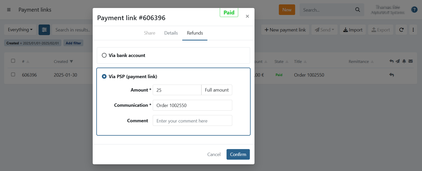 Amount : Amount to refund (full amount is prefilled by default).Communication : The refund communication.Comment : Optional internal comment.Click Confirm . The refund is sent to your provider immediately. Last Update: 2026-03-11