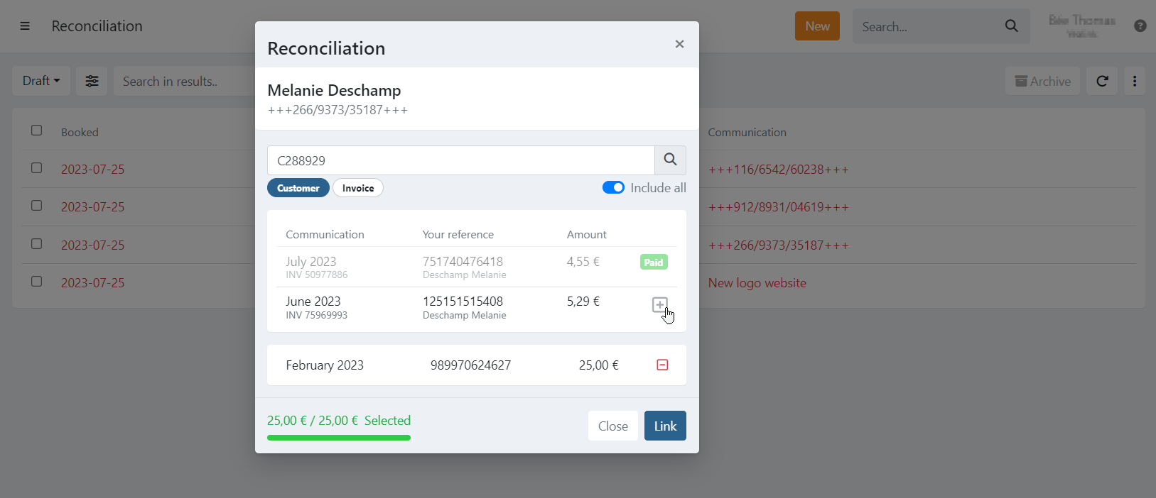 Multiple invoices can be matched to one transfer. The total amount of the selected invoices must exactly match the transfer amount.