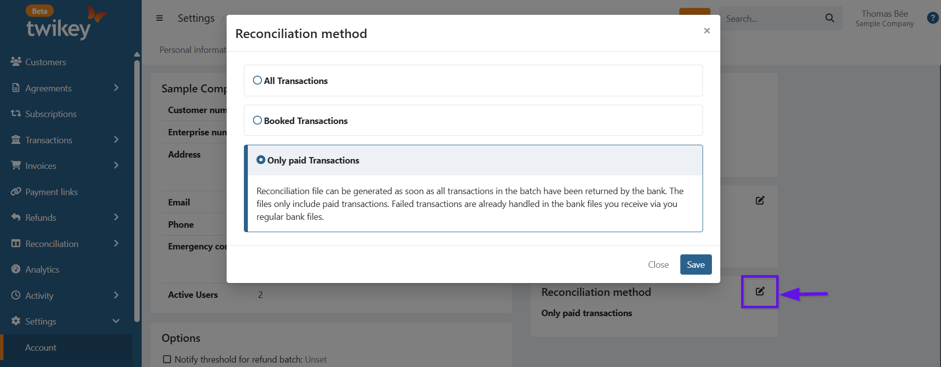 For CODA, CAMT053 and MT940 files, which transactions are included depends on your selected Reconciliation method. Regardless of that setting, transactions that originally failed but were later recovered — either through the dunning workflow or manually marked as paid — are never included. These were not settled via the bank and would break the 1-on-1 match with your bank file.