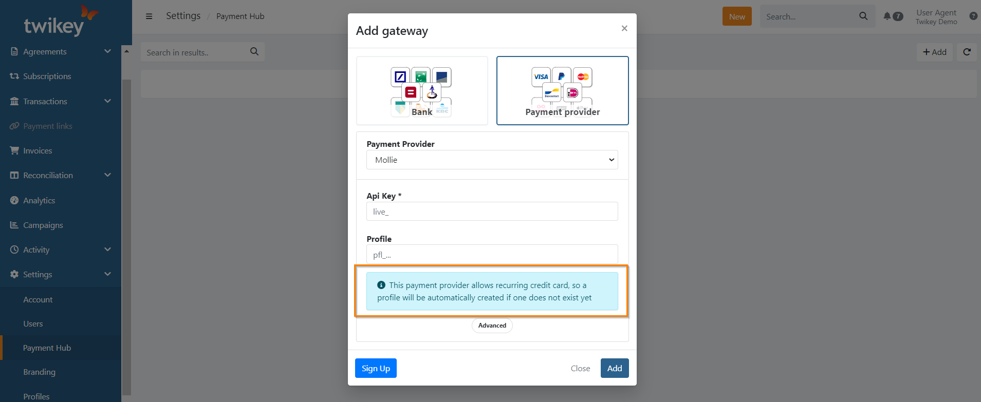 If your provider supports recurring credit card payments, Twikey will notify you that a new profile will be created automatically if none exists yet.