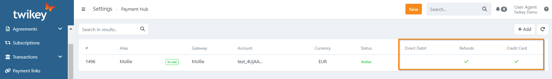 - Twikey updates this list automatically when a new payment solution is configured.