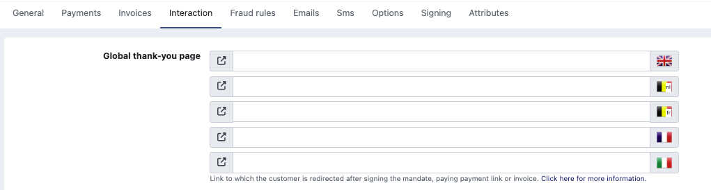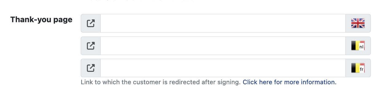If you want your customer to be redirected to a specific web page after signing your document, paying a payment link, invoice,... you can enter the URL here. Always use http(s):// or, for mobile applications, the mobile prefix.