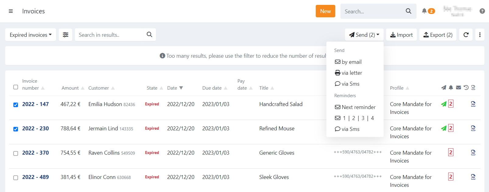 On the invoice overview click on any invoice to open the invitation modal. On the invoice details you can use the button to open this modal. Different invitation and reminder options are available: