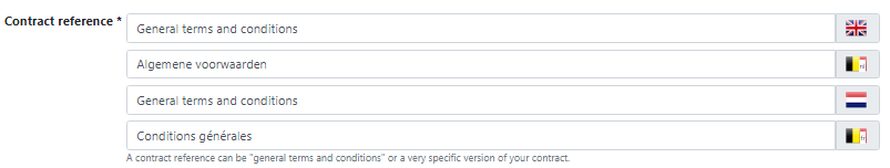 In this configuration option, you can see and edit the contract reference of all agreements that falls under the umbrella of this profile (in all of the languages that have been enabled on the Languages Used configuration option).