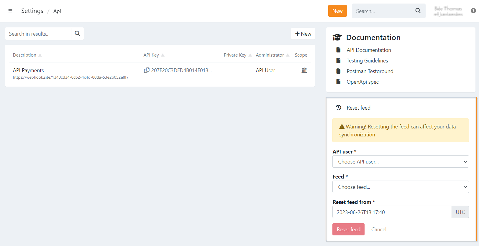 Changes only apply to this user, other API users are not affected - Select the scope of the feed you want to reset (e.g., Contracts, Transactions,...)