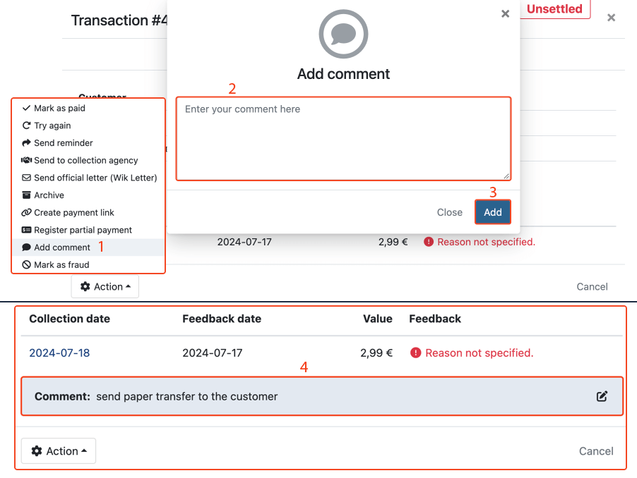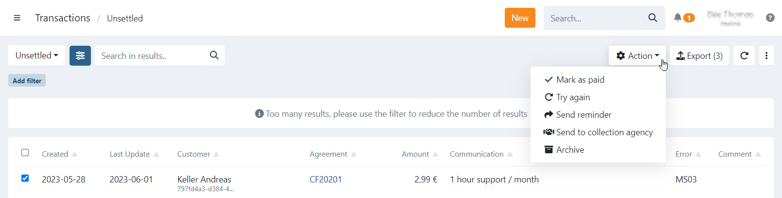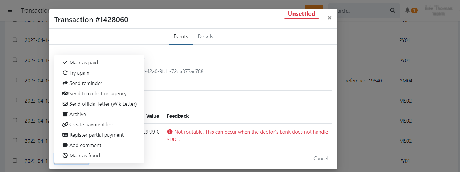 From the Unsettled transactions screen, you can take action on transactions that are no longer part of an automated or manual dunning workflow.