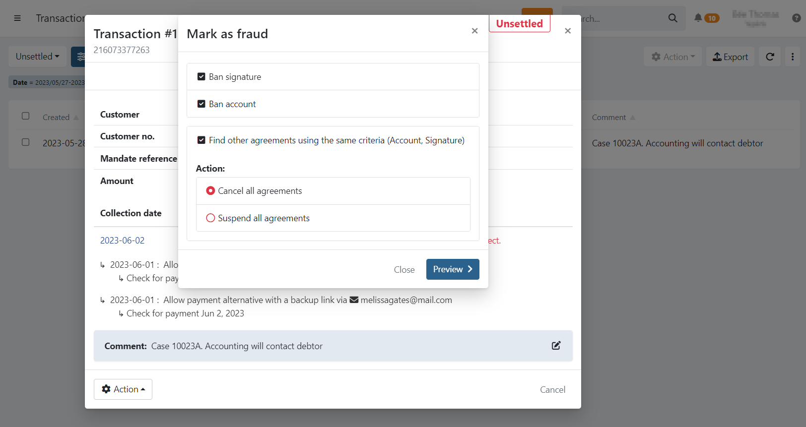 Use this action when fraudulent behaviour is suspected or confirmed.