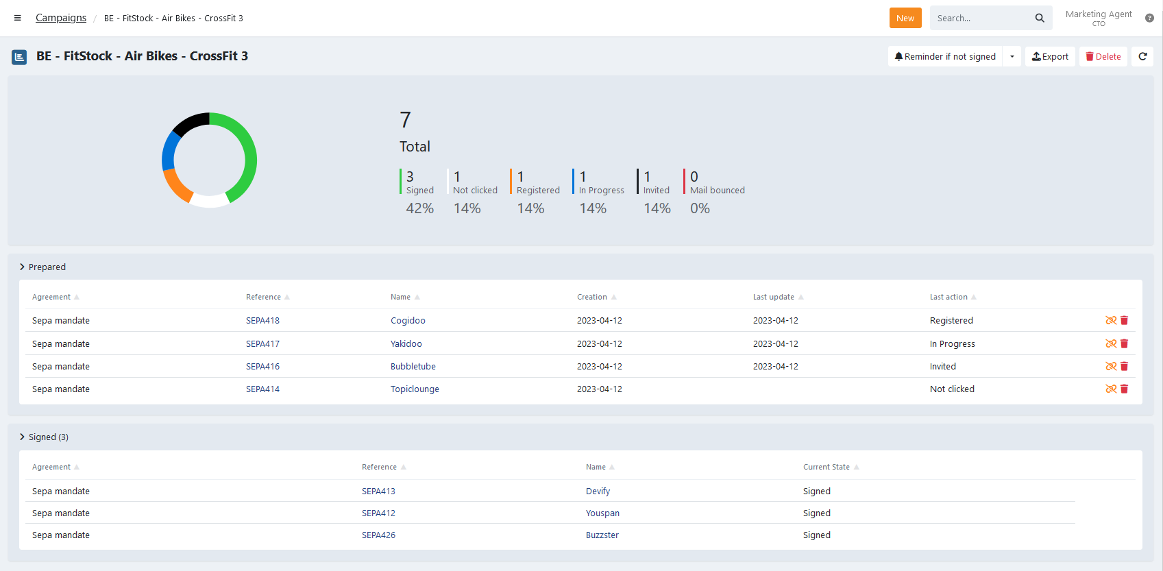 You can easily send the invitation or reminder to sign to your customers for all the agreements in a campaign.