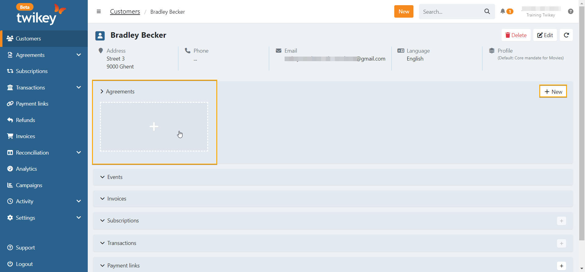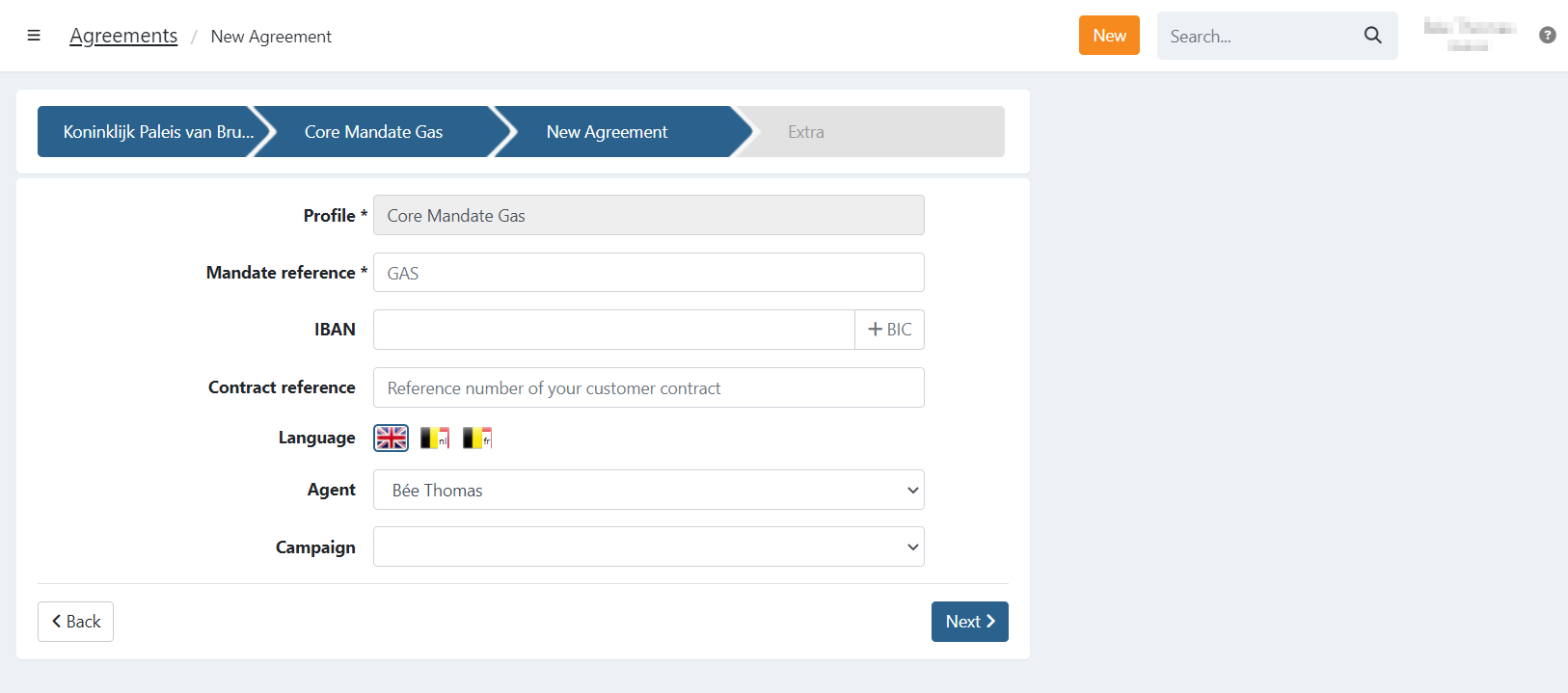 Create a new agreement (using the global New button or the New button on the agreements page) and define the customer (select an existing customer or create a new customer.)