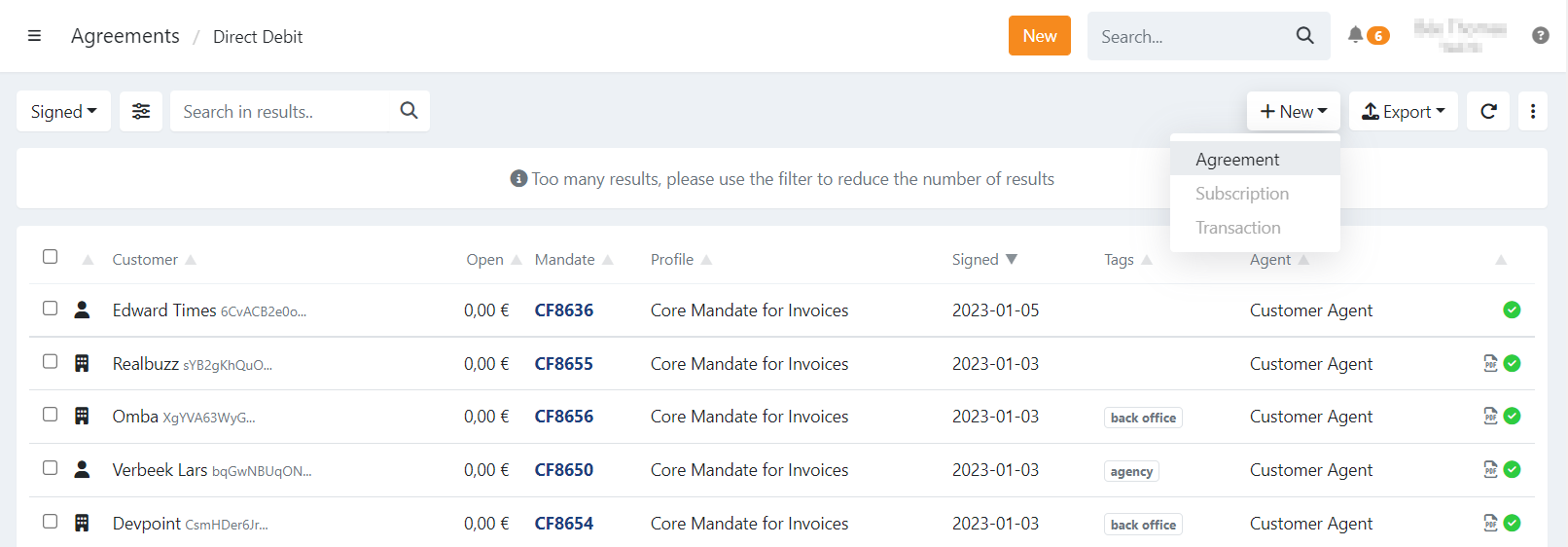 Use the global New button on the top right or go to the agreements overview, click on and select Agreement.
