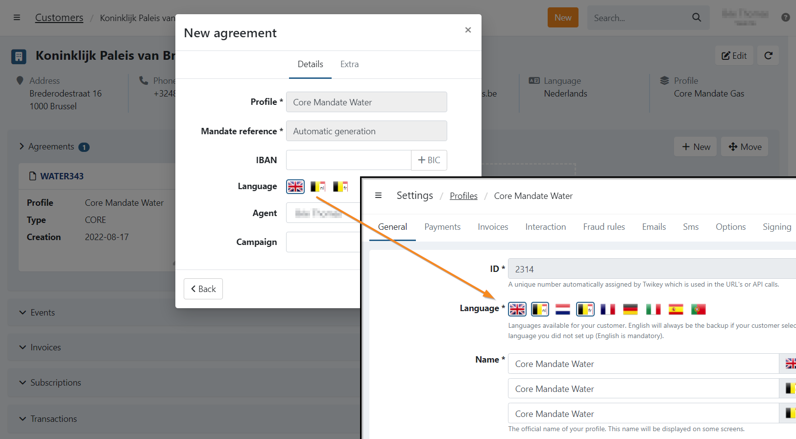 The languages you can select during creation are those enabled on the selected profile. The communication and signing pages for the end customer are in the language defined on the agreement.