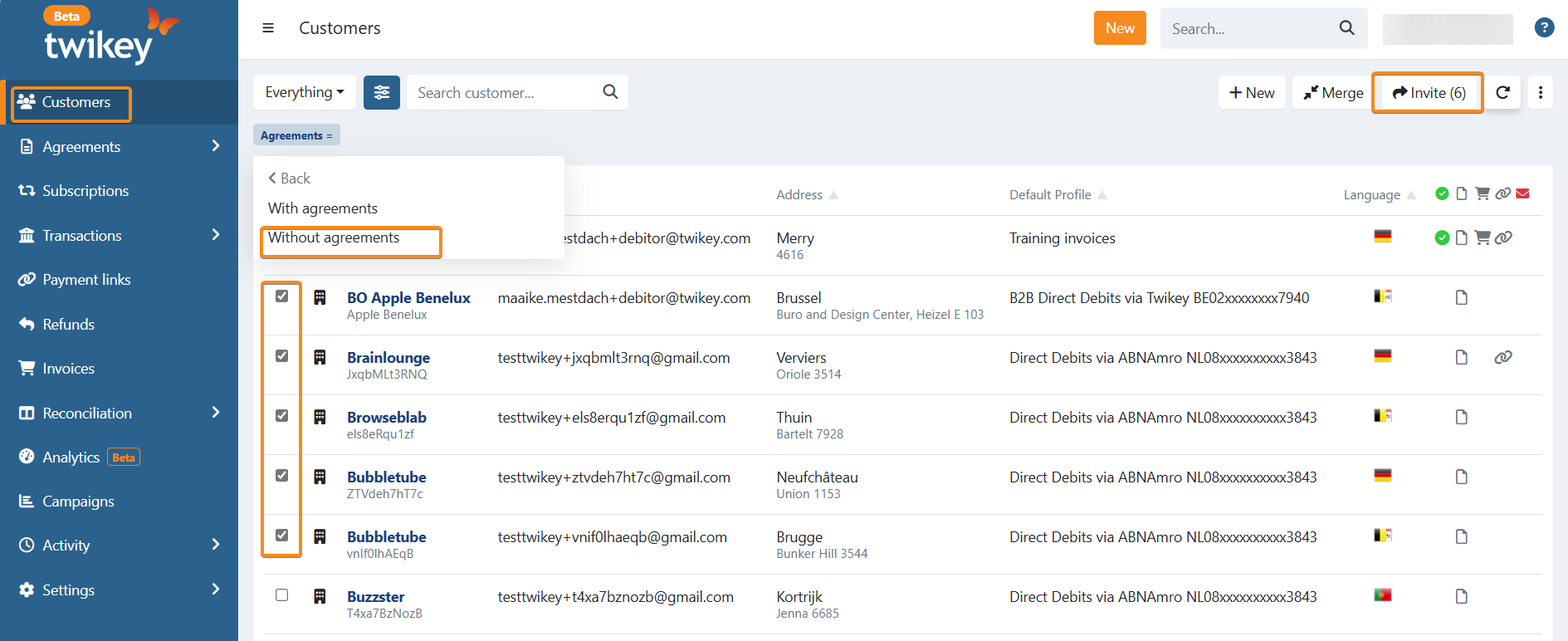 Find the customers: navigating to the "Customers" tab and add filter agreement, set filter 'without agreements'