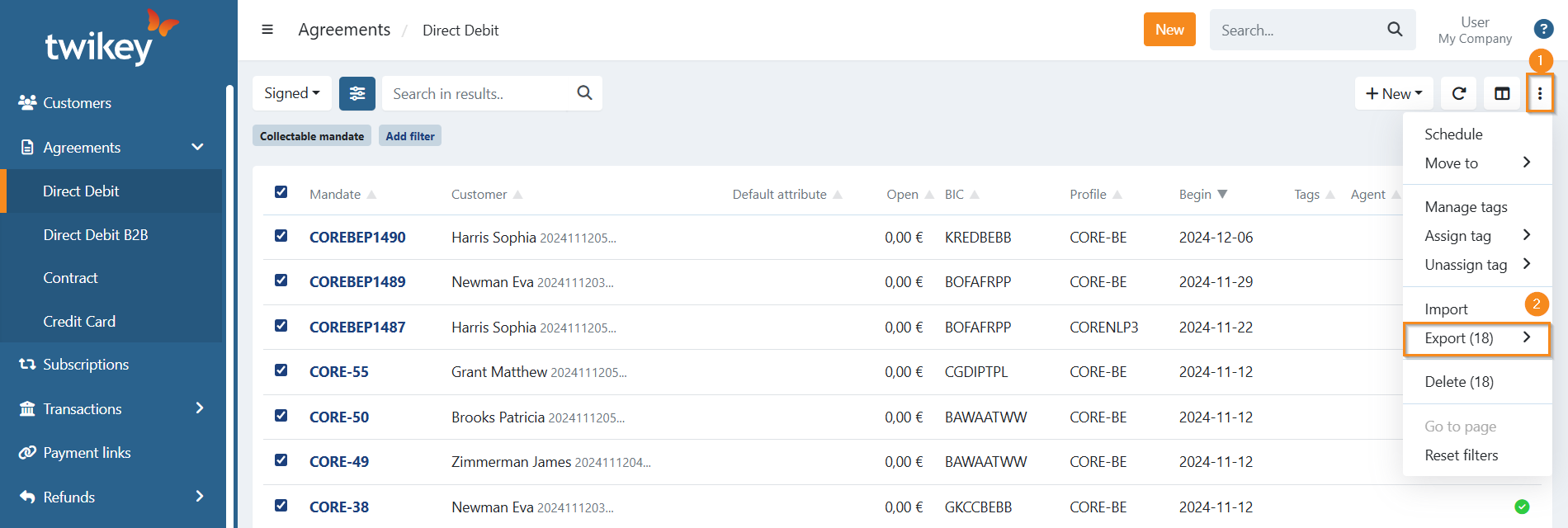 The export can be done based on your current filter or a specific selection of individual agreements.