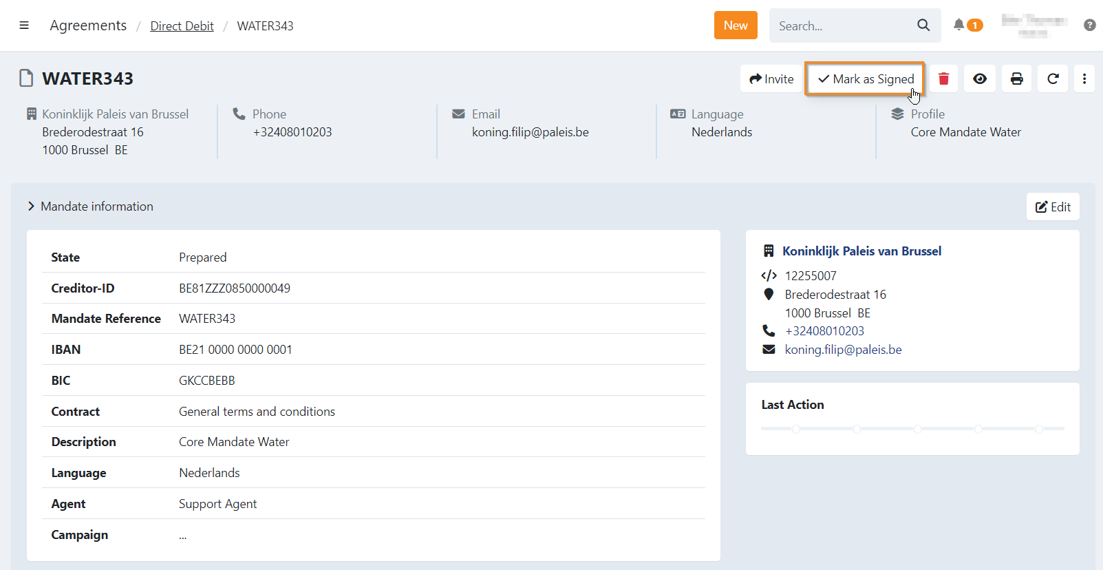 Check this box when the agreement is signed by all the required persons. You can change the sign date by clicking on the date. Some banks require that the signature date of the mandate (for B2B) correspond to the sign date in their system, otherwise collections could be refused.
