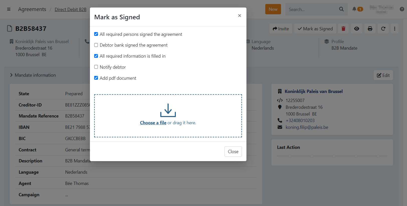 The required document(s) can be uploaded by the end-customer or you can upload them yourself when marking the mandate as signed.