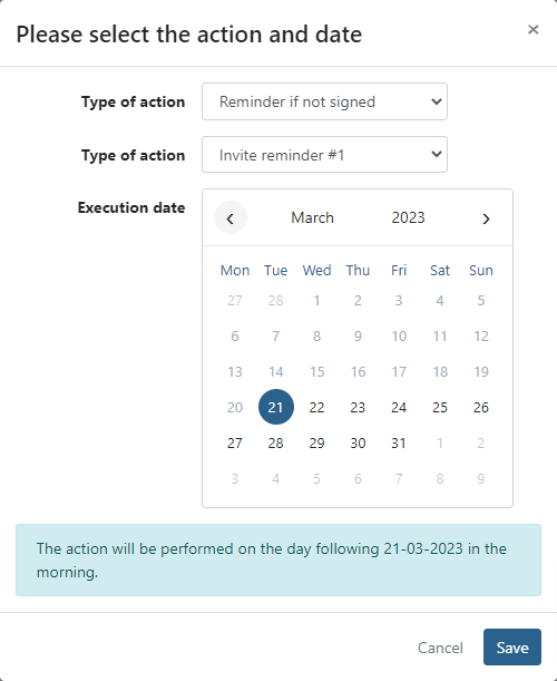 A modal window opens where you can select the desired action and specify the date on which the action should be executed.