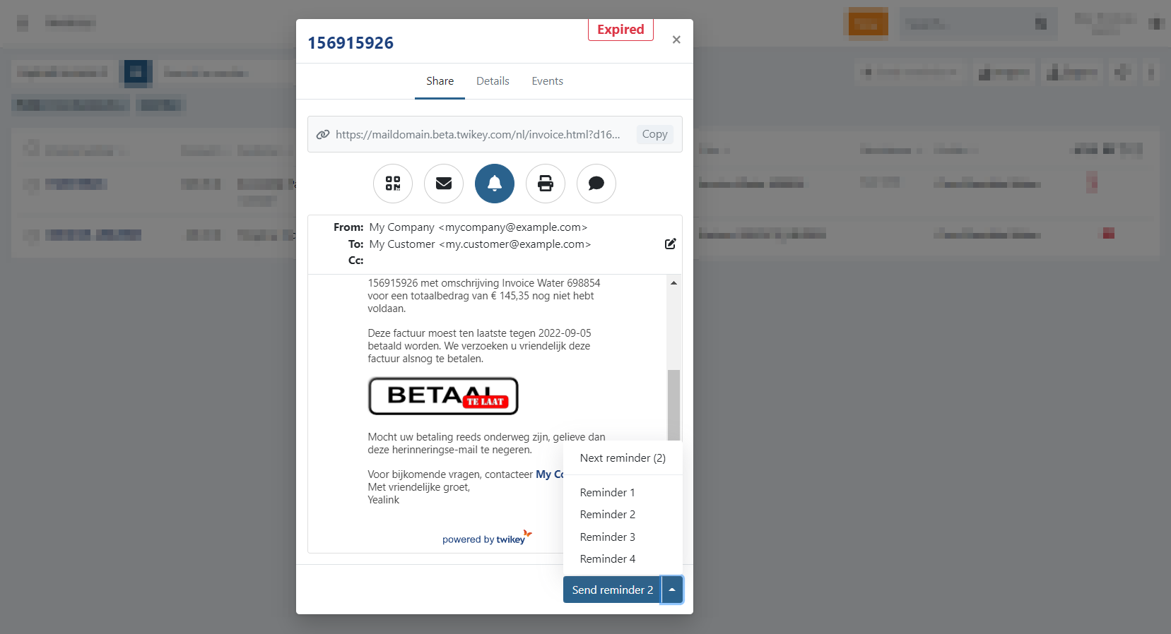 On the invoice overview click on any invoice to open the invitation modal. On the invoice details you can use the button to open this modal.
