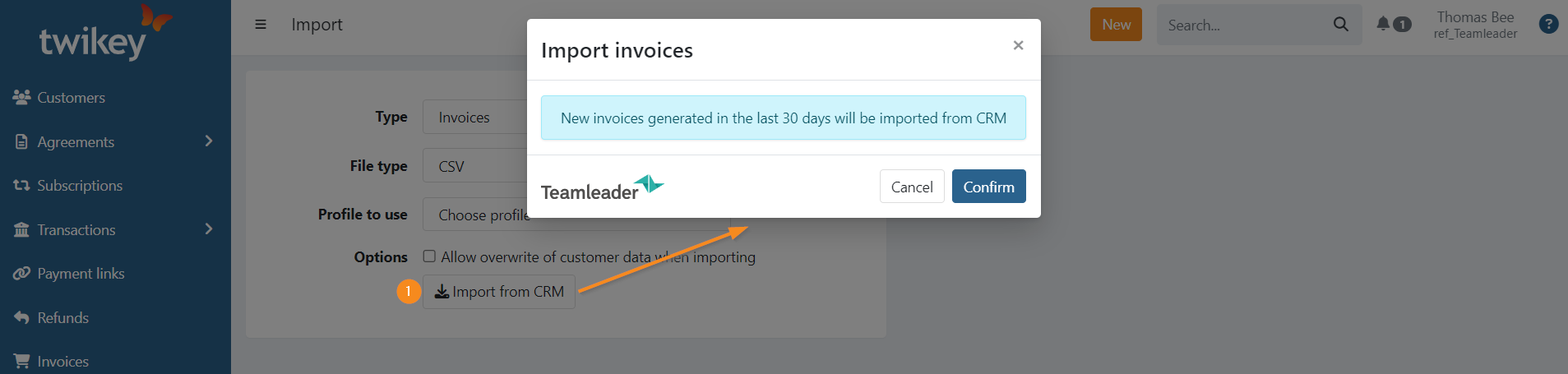 Invoices booked in Teamleader can be imported automatically or manually into Twikey.