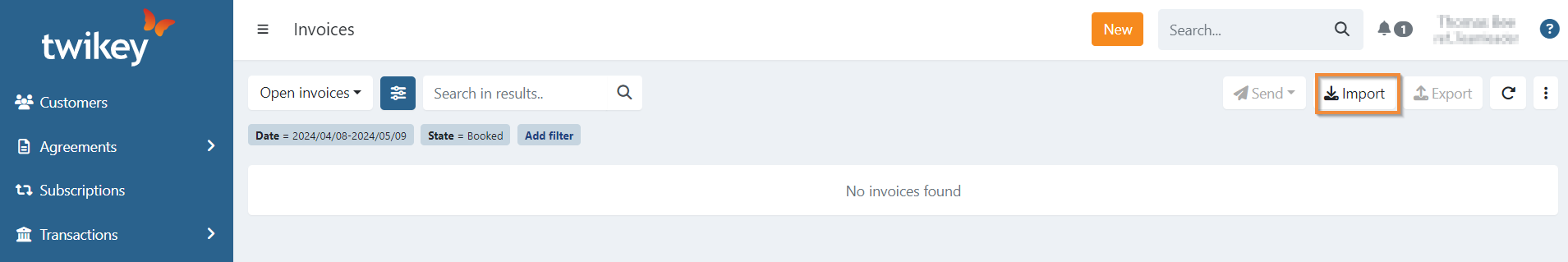 To manually import invoices go to the invoices overview in your Twikey environment.