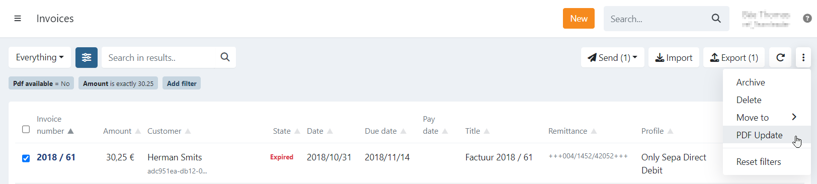 The retrieval of the document(s) of the invoice(s) (PDF) are scheduled and imported at a later time. When the document is available the PDF-icon is displayed next to the invoice.