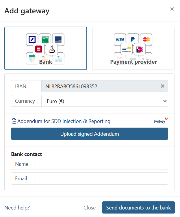 The activation process is now ongoing. First Twikey reviews the documents to ensure they are valid and your gateway is awaiting Twikey approval, after this they are sent to your bank.