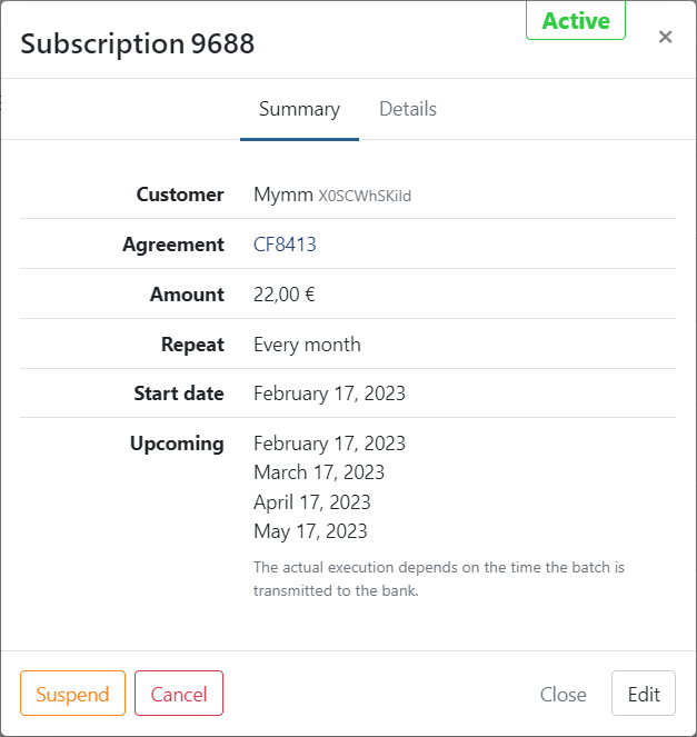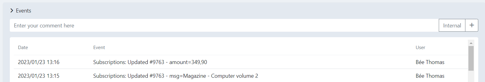 Each change made to a subscription is returned in the events on the overview of the agreement and customer.