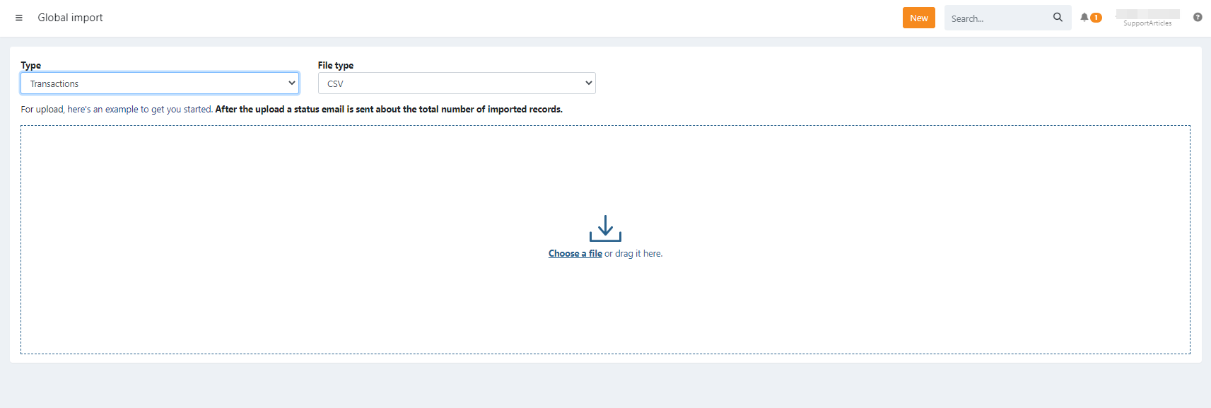 On the import page, select "Transactions" from the dropdown menu, choose the format (CSV), and upload your file.