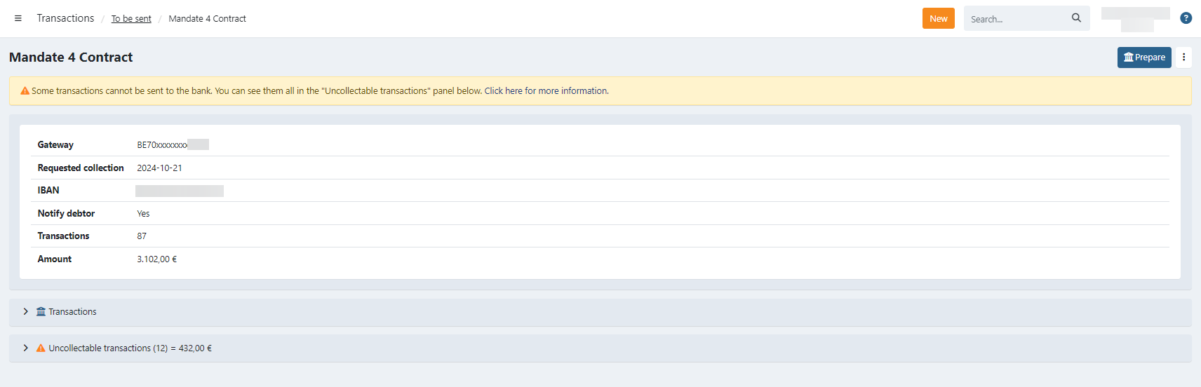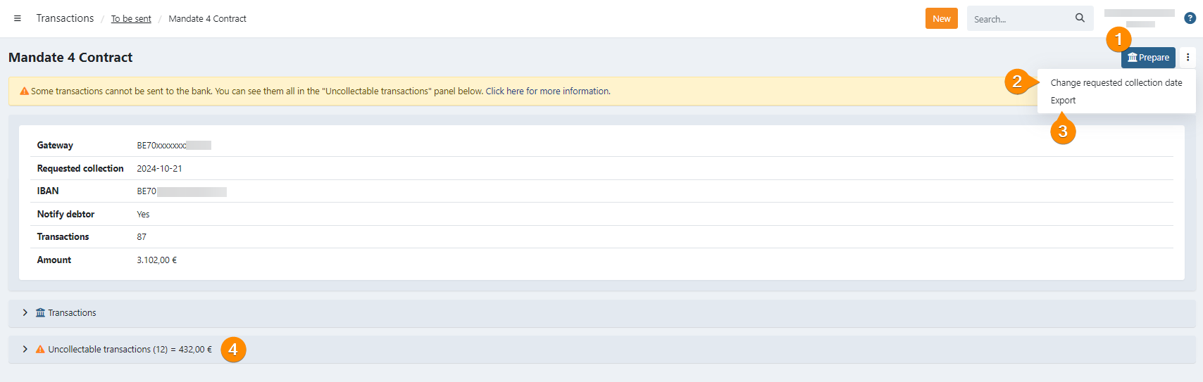 On the details of a To be sent profile, you find various information about transactions that are ready to be sent and the ones that are uncollectable due to the status of the mandate.
