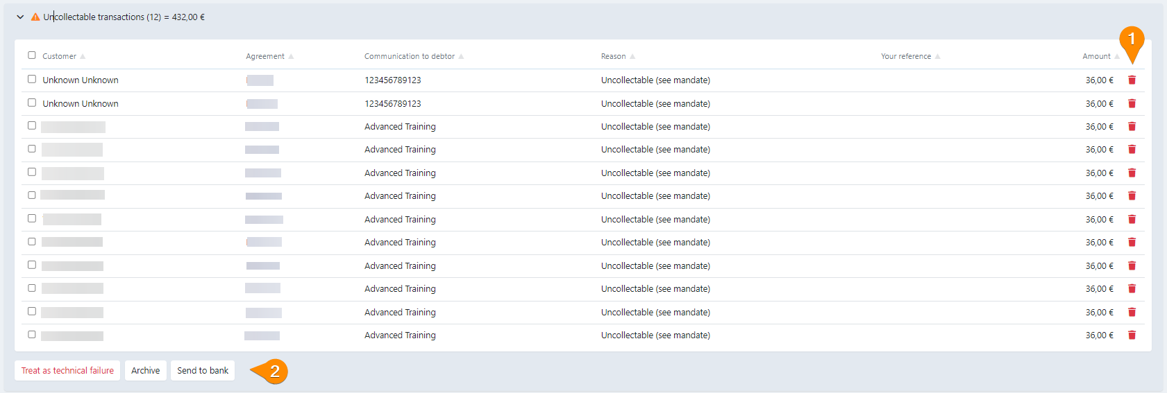 Proceed with caution: This action can not be reverted. For 'Treat as technical failure' and 'Send to bank' dunning is applied when configured.